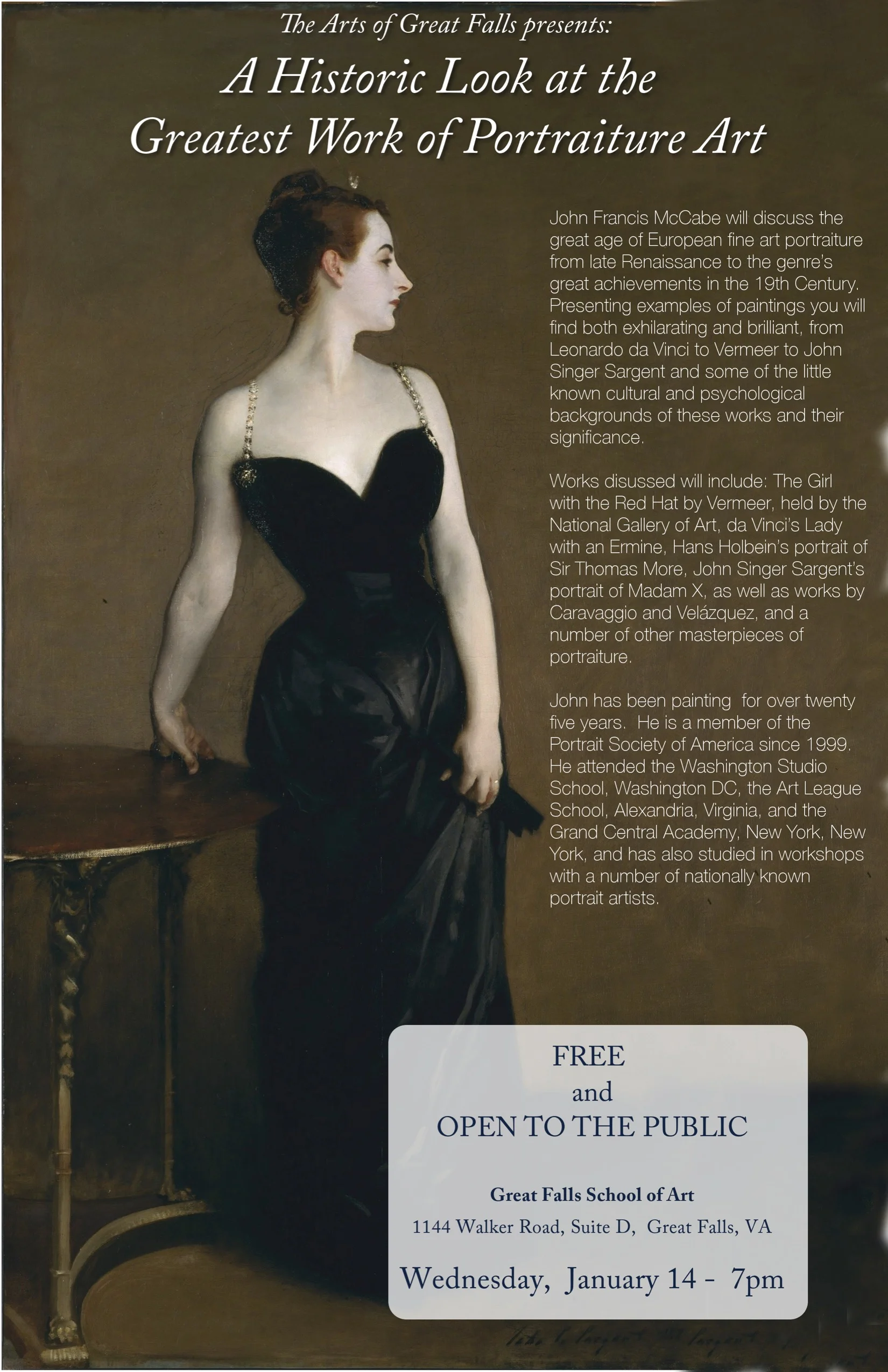 John Francis McCabe will talk about the great age of European fine art portraiture from the late Renaissance to the genre’s great achievements in the 19th Century. The talk will present and discuss examples of paintings you will find both exhilarating and brilliant, from Leonardo da Vinci to Vermeer to John Singer Sargent. John will show these iconic paintings and discuss some of the little known cultural and psychological backgrounds of these works and explain their meaning.