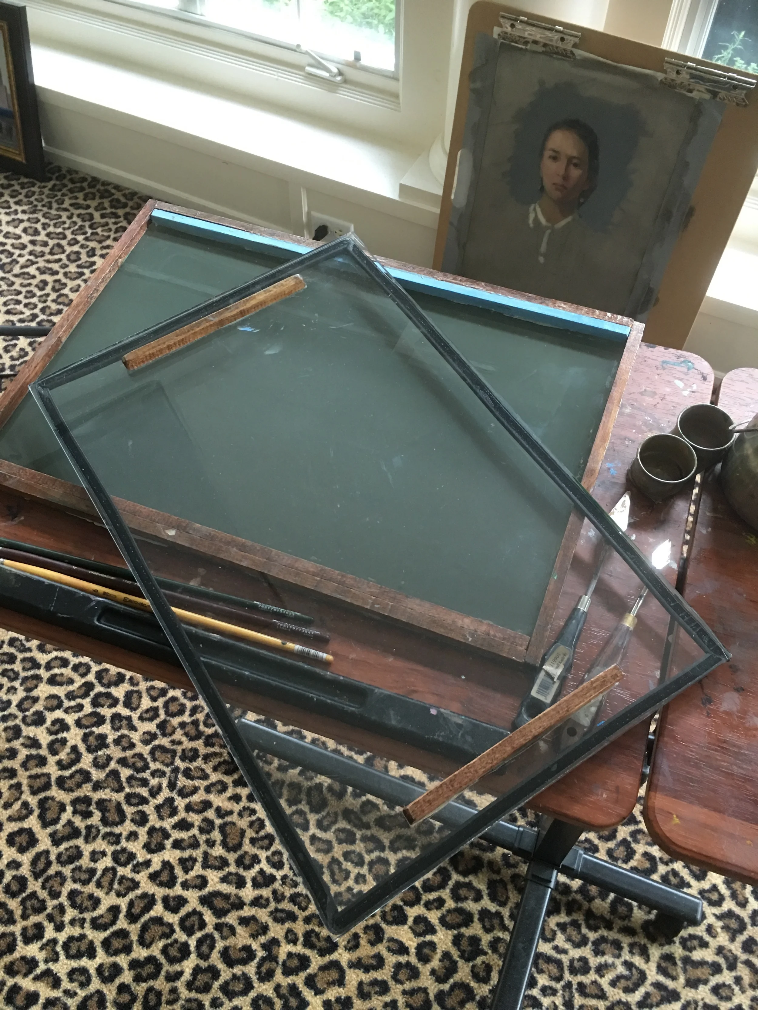 What are the objectives of a great palette, beyond holding paint? My answer would be: right size, right color for keying off values and hue, portable, light weight, capable of being sealed for storing paint, including in freezer, easily cleaned, and indeed, capable of being propped up vertically right next to the painting. This puts the palette in the same light as the painting and frees a hand to hold a maul stick or other tool. Although placed parallel to the canvas, the paint will not slide. If you have a problem with a particular tube, hit the tube against a flat surface at the cap – not to hard - that will mix the pigment with the oil. I call this palette the McCabe Studio Upright Palette.